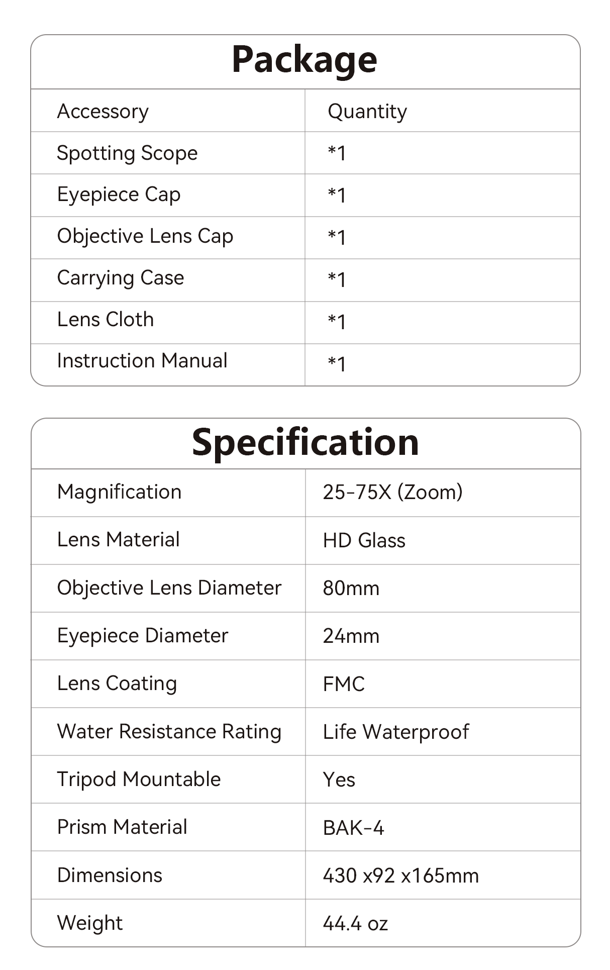 - 25–75X Continuous Zoom – Easily adjust magnification to suit different viewing distances.